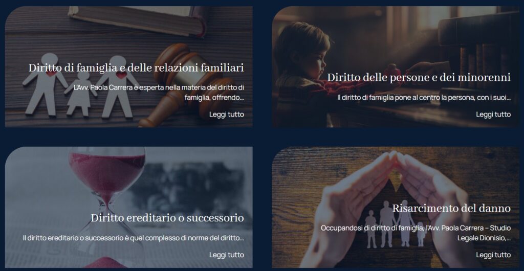Per l’Avv. Paola Carrera, specializzato in diritto di famiglia e delle persone, abbiamo realizzato un sito web istituzionale elegante e funzionale, volto a comunicare professionalità, chiarezza e fiducia.